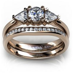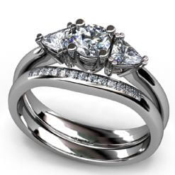 3 av bilderna visar en passande alliansring med briljantslipade diamanter som följer trestensringens form.