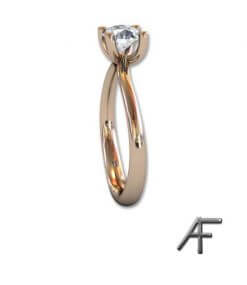 En skulptural ring i 18 k rött eller vitt guld som jag formgivit där den briljantslipade diamanten kommer till sin rätt.