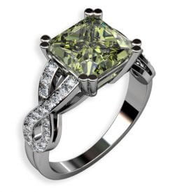Capuchongslipad sten omgiven av fadeninfattade briljantslipade diamanter. Ringens ovala del mäter ca 13 x 8 mm, men som de flesta av våra smycken och vigselringar så går det att få anpassat efter era önskemål och er hands förutsättningar.