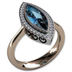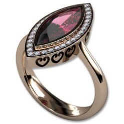 Vi kan ta fram olika alternativ på den Marquise slipade(ibland även kallad Navett slipad) mittstenen. Den rosa är en Morganit, den röda Rodolite, blå Akvamarin och slutligen en rök/champagnefärgad diamant.