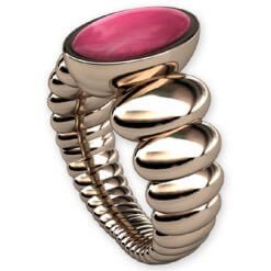 Elipsform (äggformad), doserade som tillsammans bildar en ring. Former som alltigenom är mjuka och så även på ringens insida. Ringen är massiv och dess tyngd ger en extra känsla av exklusivitet.
