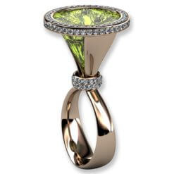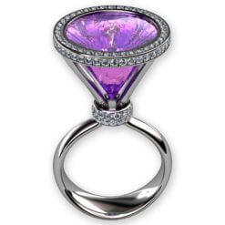 De små stenarna är briljantslipade diamanter som är fadeninfattade, vilket skapar en fin kontrast mot den stora ädelstenen (mäter ca 12,5 mm i diameter).