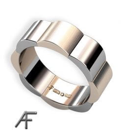Herring med en bredd av ca 7 mm i 18 k rött och vitt guld. Vid formgivning av ringen så har jag haft klockarmband i åtanke när jag formgivit ringen. Vi tillverkar denna ring i bredder från 5 mm och uppåt. Leveranstiden är ca 4 veckor.